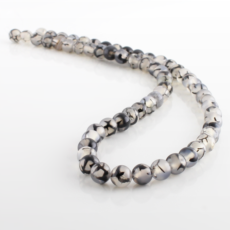 Hay varios tamaños disponibles de bolas de ágata dragón gris, enfiladas en tiras con cerca de 40 cm.
