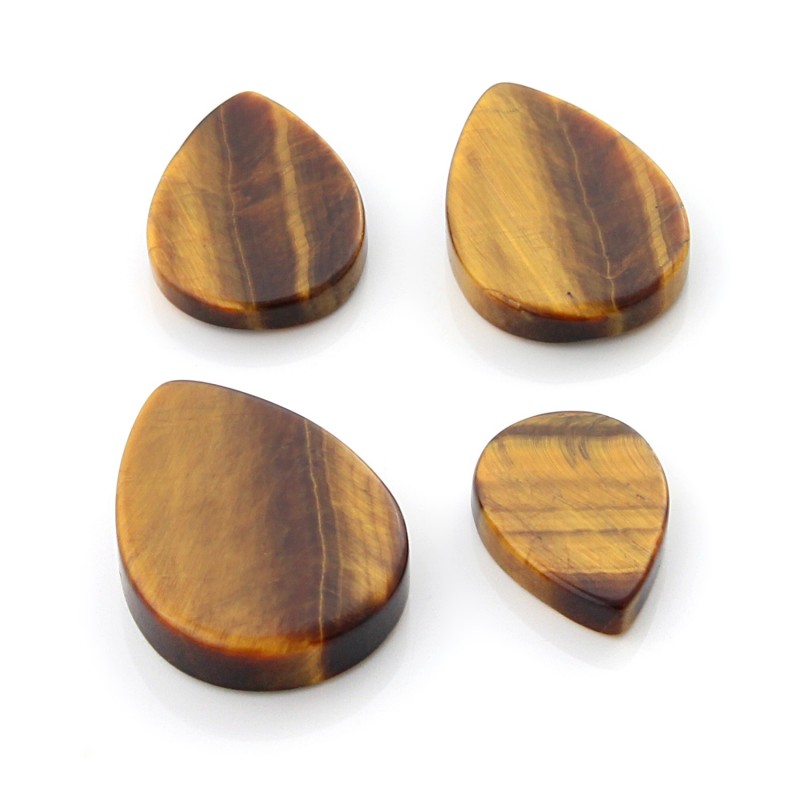 Estas gemas esculpidas en forma de pera de Ojo de tigre, presentan una forma plana y pulida por ambos lados.