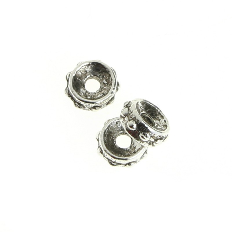 Este separador en formato rondelle puede recordar por su forma a una pandereta y tiene los lados cóncavos para poder acoplarlo entre dos cuentas esféricas.
