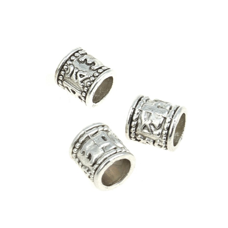Fornitura con forma de cilindro y mantra tibetano Om mani padme hum, que se podría interpretar como: ¡Oh, la joya del loto!.